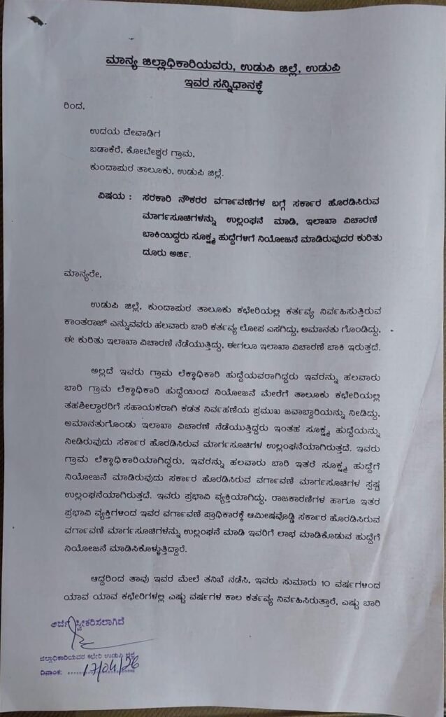 ಕುಂದಾಪುರ: ಸರಕಾರಿ ನೌಕರರ ವರ್ಗಾವಣೆ ಕುರಿತು ಸರ್ಕಾರ ಹೊರಡಿಸಿರುವ ಮಾರ್ಗಸೂಚಿಗಳನ್ನು ಉಲ್ಲಂಘಿಸಿ, ಇಲಾಖಾ ವಿಚಾರಣೆ ಬಾಕಿ ಇರುವ ನೌಕರನಿಗೆ ಸೂಕ್ಷ್ಮ ಹುದ್ದೆ ನೀಡಿರುವ ಬಗ್ಗೆ ಗಂಭೀರ ಆರೋಪಗಳು ಕೇಳಿಬಂದಿವೆ.